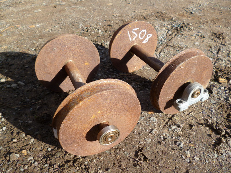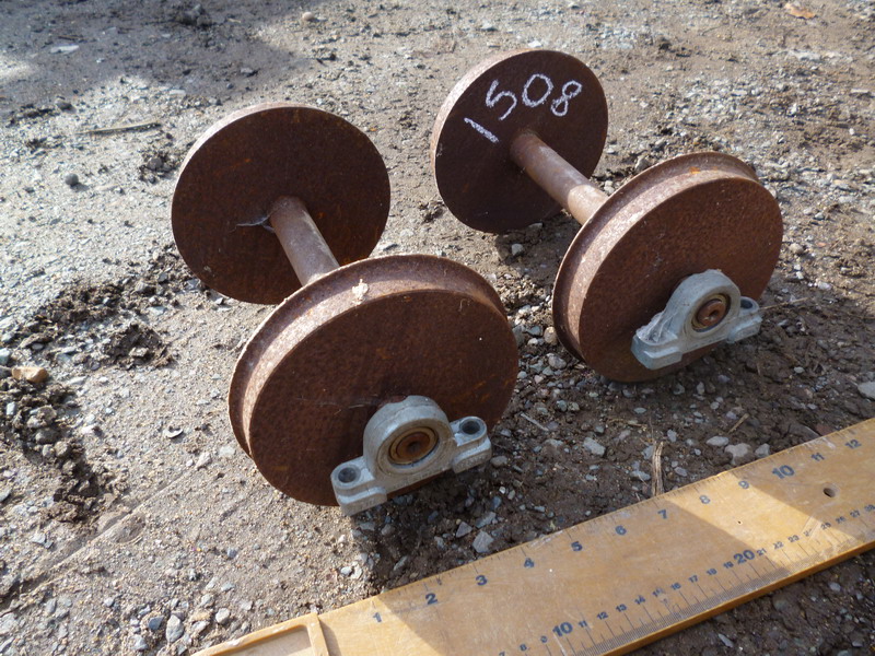 Our ref 1508 - 2 wheel sets shown These are Maxitrak wheel sets, steel wheels and axles, 3 Picador type bearings fitted between the 2 wheels sets , narrow wheels with fine flange. Wheels are 5 1/2 inch dia on tread, 22mm thick including the flange, the axle journals are 5/8 inch dia We offer these at GB Pounds 45.00 per wheel set inc VAT ex works Hemel Hempstead