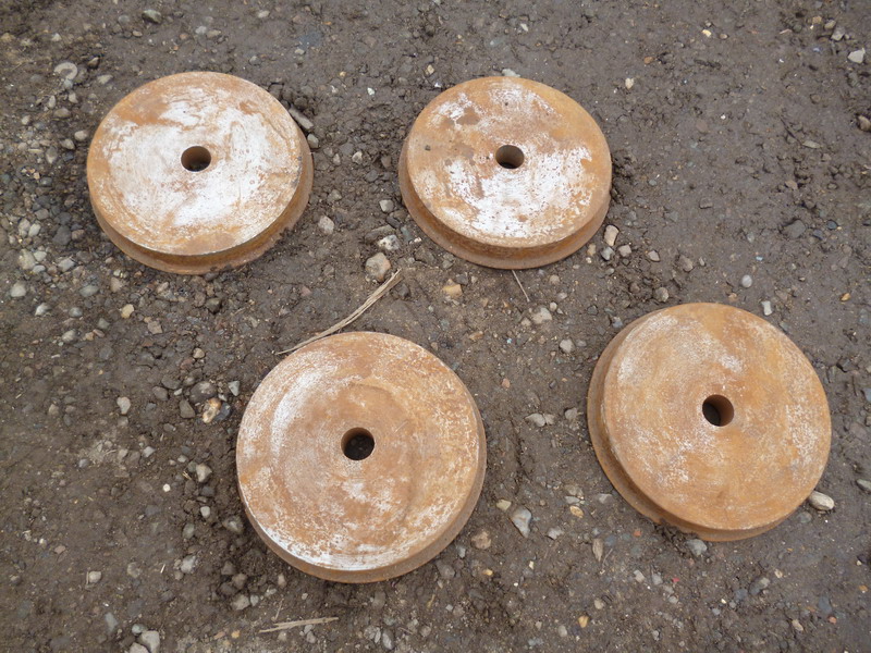 Tread dia is 200mm, bore is 1 1/8 inch dia, thickness 1.155 inch including flange, depth of flange 0.255 inch 8 off of these wheels, unused but some surface rust.